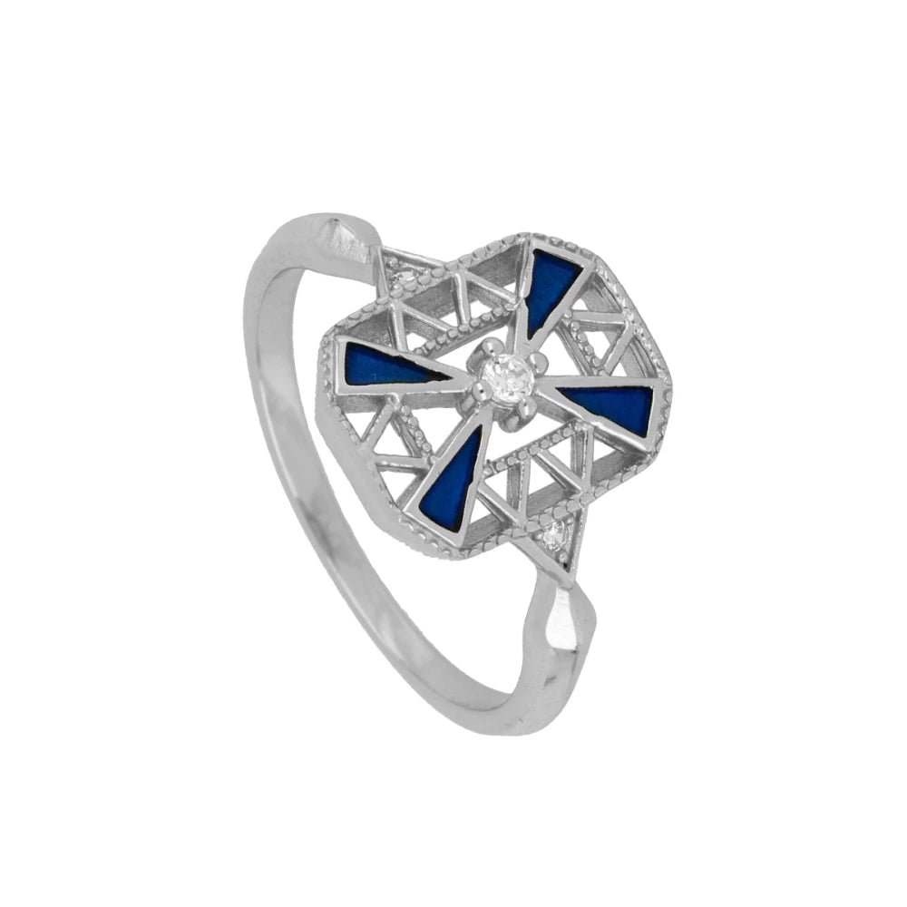 Este anillo MOSAIC destaca por su diseño elegante de motivo rectangular que alberga cuatro circonitas azules dispuestas en forma de triángulo isósceles, complementadas con tres circonitas blancas que aportan un brillo sutil y sofisticado. Ideal para quienes buscan una pieza distinguida que combine delicadeza y un toque de color refinado.